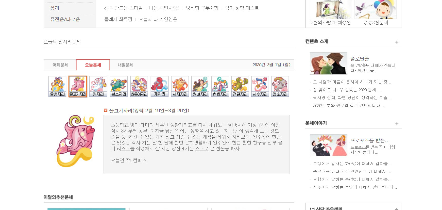 | [무료 운세]사주카페/띠별운세/궁합/시험운/건강운/이름풀이 (0) | 2020.02.29 |