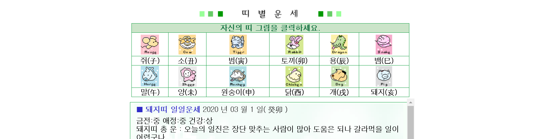 | [띠별 운세]데일리운세/경자년소띠/2020띠별운세/무료운세 (0) | 2020.03.01 |
