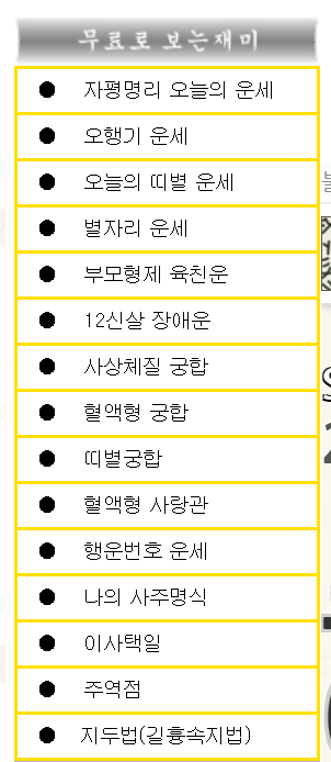 무료 운세 사이트 운세마당~! 다양한 운세가 모두 무료로 제공되고 있어요^^ 너무 많아서 몇개만볼게요 다른데 없는 사주... 인연운세풀이법 (혼인대길 귀인수 가택운) [무료 운세]천리안운세/사상체질진단/궁합/..