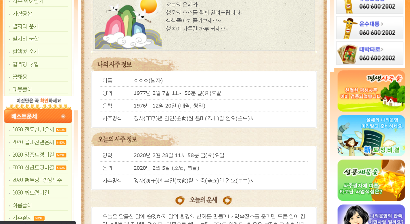 | [무료 운세]운세박사/사주정보/오늘의운세/사상궁합/사주뛰어넘기 (1) | 2020.02.28 |
