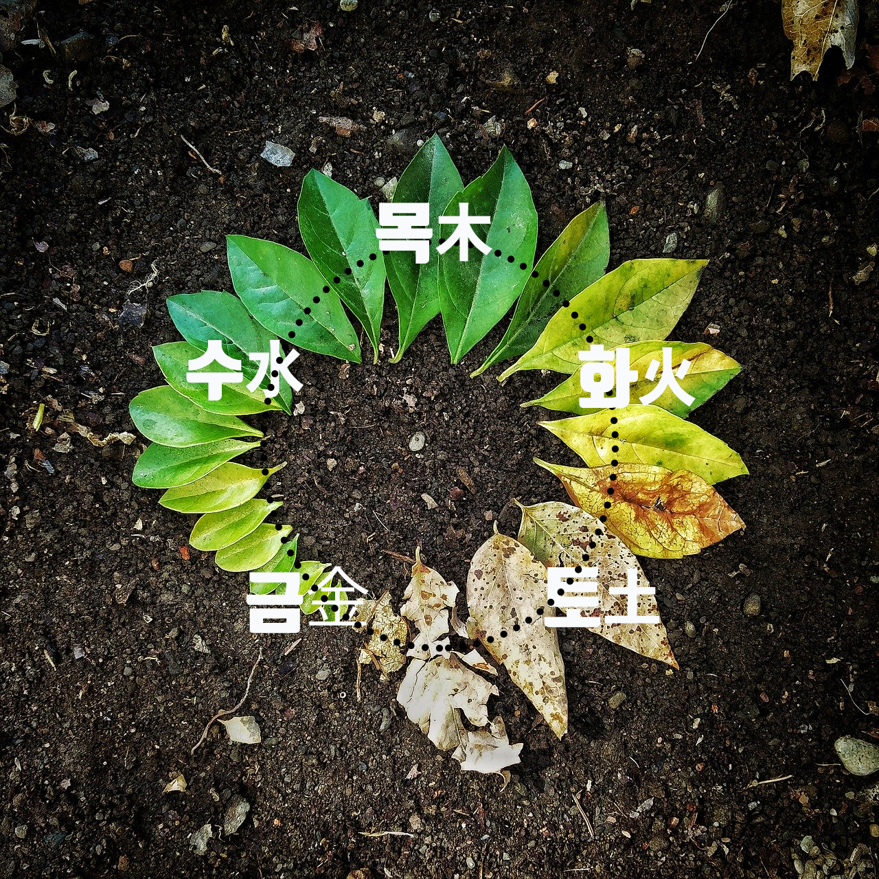 오행의 상생운동에서 토土는 화火로부터 생을 받고, 금金을 생해줍니다. 힘의 관점에서 설명해보면, 토는 화로부터 힘을 얻을 때 강해지고, 다시 금을 생해줄 때 힘이 빠져나가 약해지는 것입니다. 힘의 크기가 생을 받을 때 커졌다가, 다시 생을 해줄 때 작아지는 것입니다. 이러한 관계는 목화토금수 순서로 자리합니다. 이러한 순환 사이에서 지속되는 것이 하나 있습니다. 바로 생명력입니다. 살아가는 것을 이어가기 위해 서로에게 힘이 되어주기도 하고, 서로를 극하기도 하면서 힘의 균형을 맞추는 것입니다.